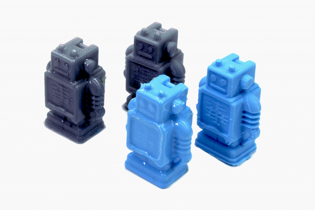 Esimerkkejä trikloorimetaanilla toteutetusta jälkikäsittelystä. Taka-alalla käsittelemättömät robotit ja etualalla 10 s trikloorimetaanissa ollut robotti (harmaa) ja 1 min trikloorimetaanissa ollut robotti (turkoosi).